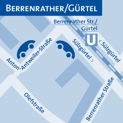 Oberirdische Stellplätze in der Anton-Antweiler-Straße am Sülzgürtel vorn 2 und hinter der Tiefgarageneinfahrt rechts 4 Parkplätze.