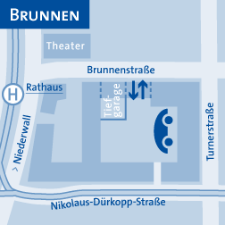 Die Station befindet sich im Innenhof des Gesundheitsamtes. Die Zufahrt erfolgt über die Brunnenstraße, links neben der Einfahrt zur Tiefgarage "Am Theater".