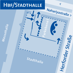 Die Station befindet sich im Parkhaus der Stadthalle auf Ebene 1, direkt links durch die gekennzeichnete Tür an der Einfahrt, auf den Stellplätzen 1.02 bis 1.06. Die Eingangstür zur Station ist tagsüber geöffnet und lässt sich einfach per Hand öffnen. Sollte die Tür verschlossen sein, öffnen Sie diese bitte mit dem Button "Zugang zur Station" in der cambio-App.