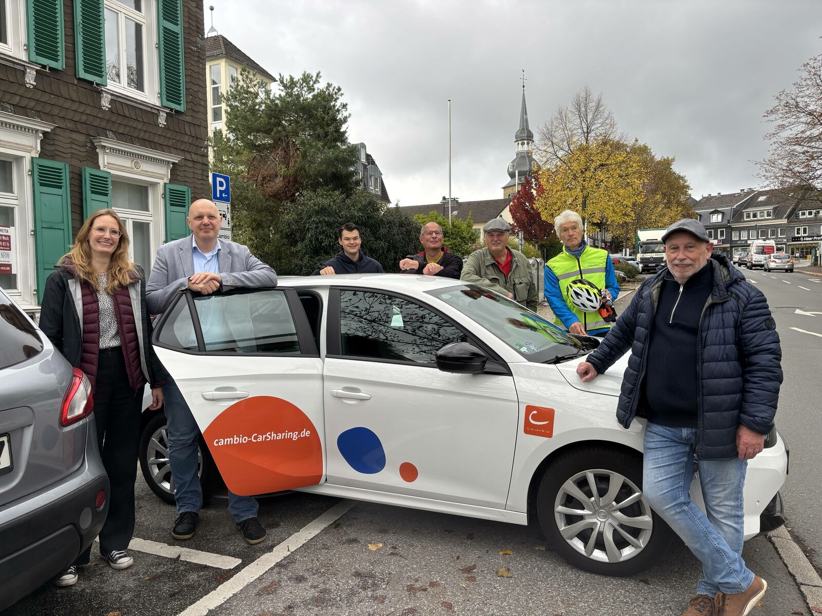 Stationseröffnung in Cronenberg V.l.n.r.: Stella Schwietering (Stadt Wuppertal), Henrik Hallmann (Standortmanager cambio Wuppertal), Alexej Hundt, Arndt Longrée, Peter Damaschke, Oliver Wagner und Dirk Wallraf (alle Bezirksvertretung Cronenberg). Foto: Stadt Wuppertal.