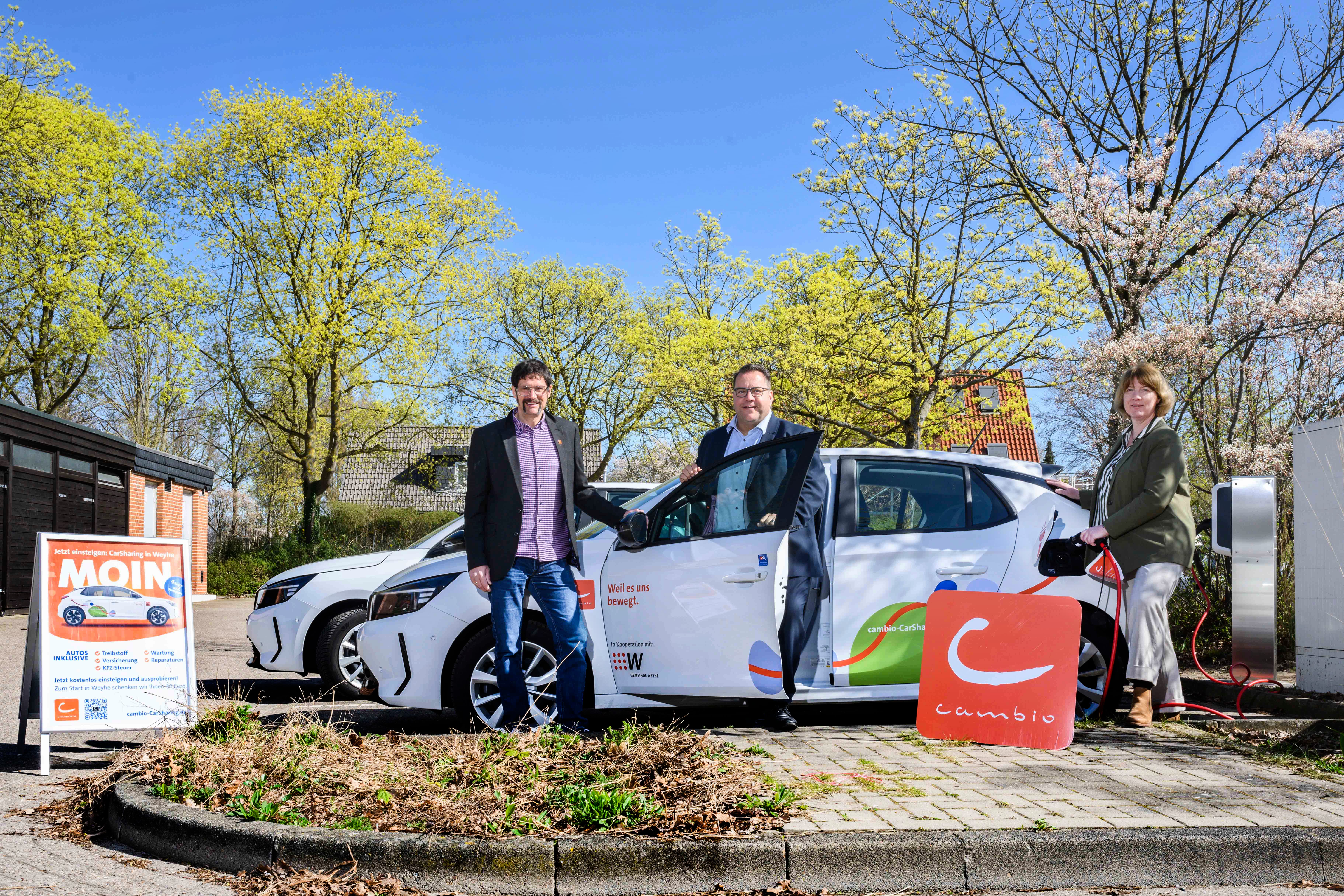 Eröffnung in Weyhe v.l.n.r.: Fleming Erdwiens, Standortmanager cambio Bremen, Frank Seidel, Bürgermeister Gemeinde Weyhe und Kirstin Taberski, Klimaschutzmanagerin. Foto: Kerstin Rolfes / cambio
