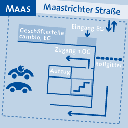Garage Hemmersbach, linke Einfahrt. Stellplätze 1. OG. Zugang: Nutzen Sie die Funktion "Zugang zur Station" auf der Startseite Ihrer App (ggf muss eine aktuelle Version heruntergeladen werden) oder Lesegerät für cambio-Karte neben der Haustür an den Klingeln. Ein-/Ausfahrt: Rollgitter öffnen: Per Handsender (Mittelkonsole) oder per Schlüssel (am Autoschlüssel). NIE auf 2. Etage fahren (geringe Deckenhöhe)!