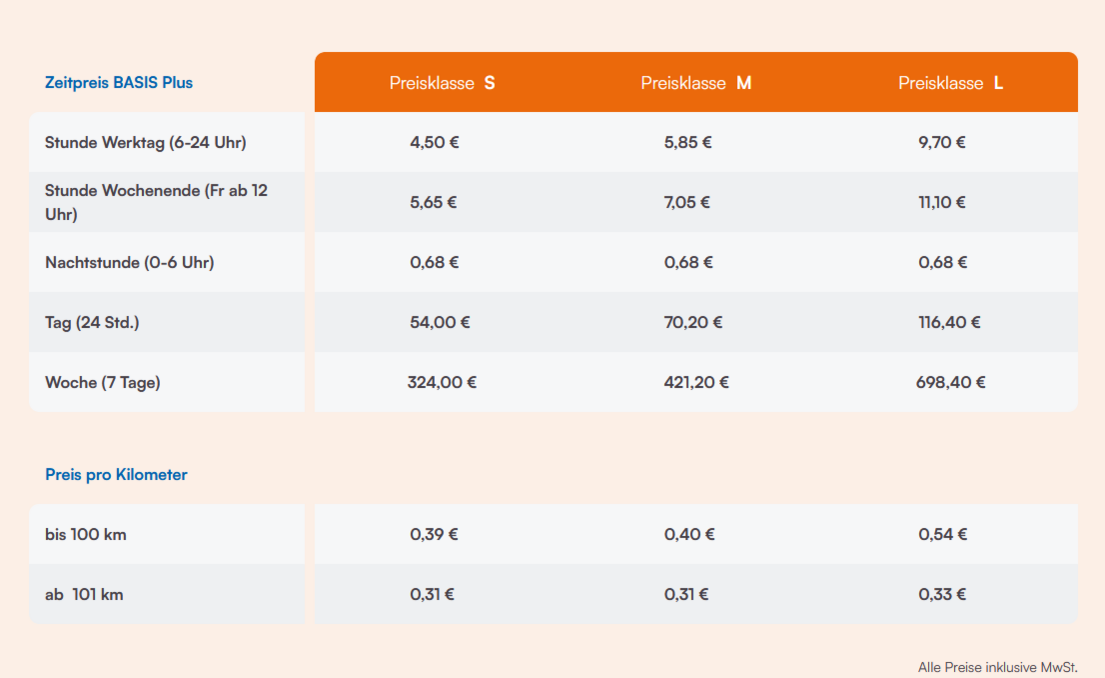 Unsere Kilometerpreise gelten für einen durchschnittlichen Benzinpreis (E5) ab 1,55 Euro. Ab 1,70 Euro je Liter werden die Kilometerkosten um 1 Cent erhöht, ab 1,85 Euro um 2 Cent, ab 2,00 Euro um 3 Cent, ab 2,15 Euro um 4 Cent je Kilometer. Die Höhe der Anpassung basiert auf dem durchschnittlichen Preis der vergangenen 14 Tage.